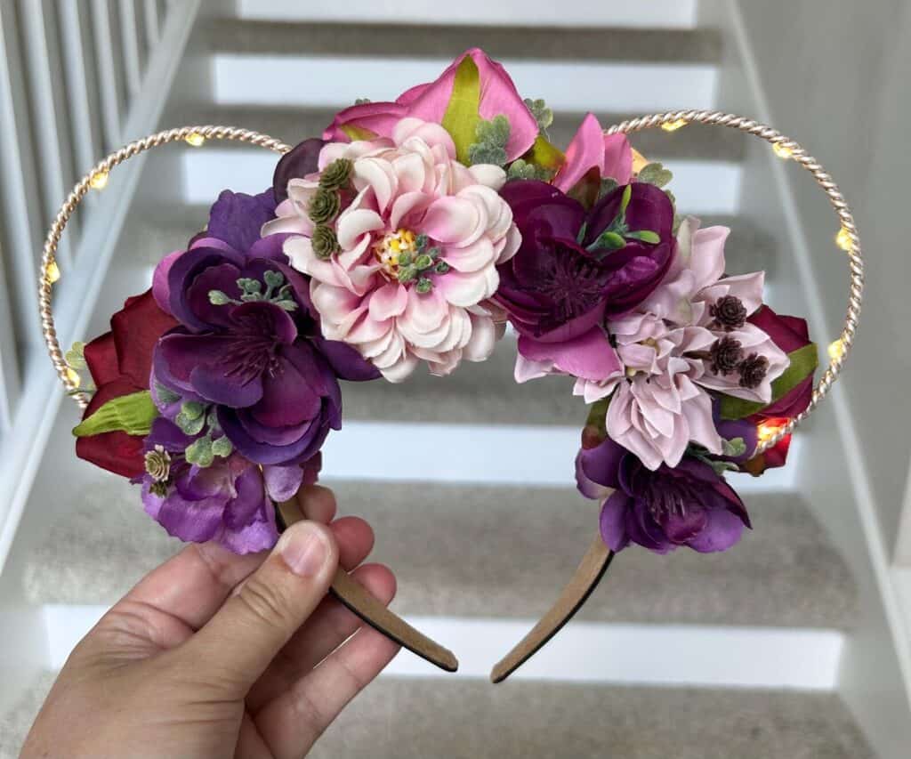 The design features a crown of blooming flowers in deep purples, burgundy reds, and soft blush pinks. Each petal is carefully arranged to create a lush, garden-inspired effect that feels both romantic and sophisticated. The look is elevated further with golden wire ears wrapped in twinkling fairy lights, giving off a soft glow. These light-up accents will sparkle as the sun sets, making them ideal for both daytime strolls and evening fireworks.