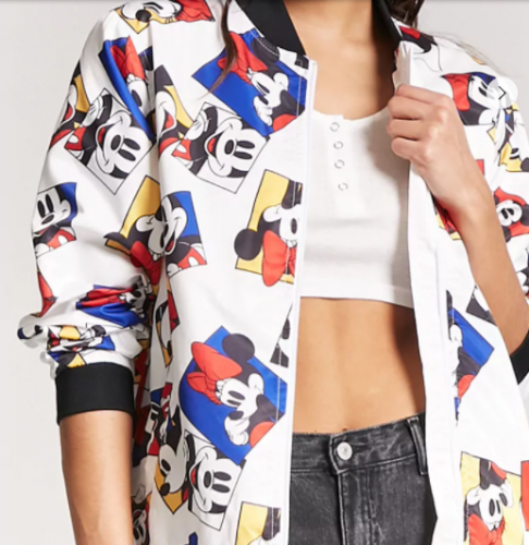 Vibrant images of Minnie and Mickey Mouse adorn this lightweight woven bomber jacket. The jacket has a stand collar, and a zip-front closure. The slant front welt pockets add a nice shape to the jacket that is flattering too. A jacket like this can be paired with your favorite Disney tee, or to add a bit of Disney magic to a solid sun dress. Plus, this Disney Bomber Jacket is available at Forever 21 for just $34.00 too!