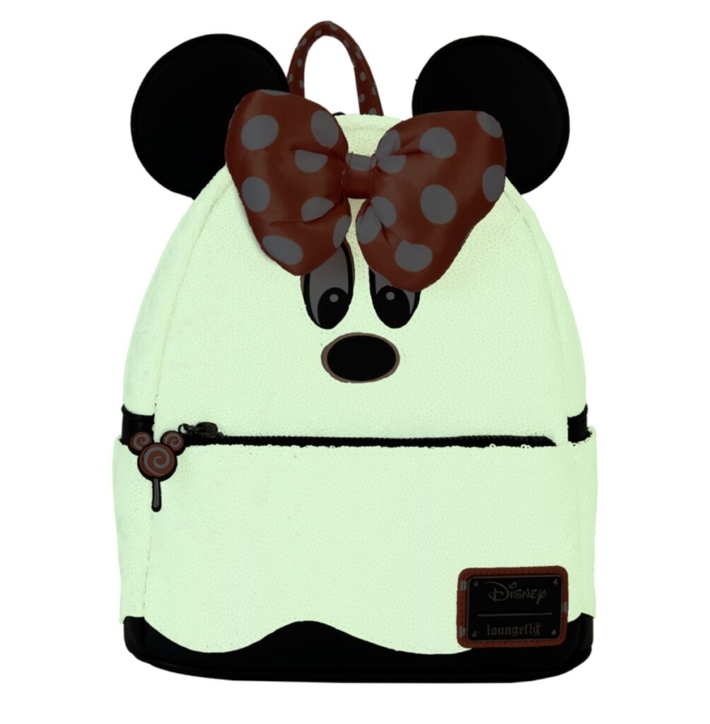 What is cuter than Mickey as a bat? Mickey AND Minnie as bats! This mini backpack features the best couples’ costume around! The vampire bats are facades for front zipper pockets. ANNNDDD if that’s not enough, Mickey’s wings move up and down to help him fly. Not to be outdone by the Ghost Minnie bag, the background stars glow in the dark.