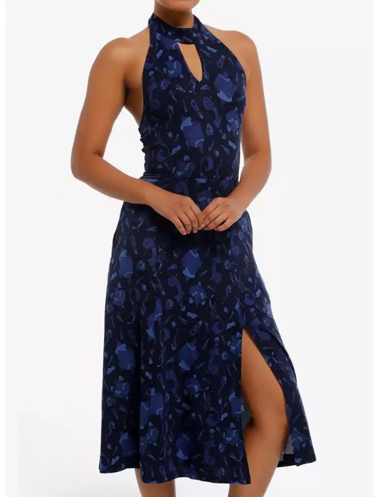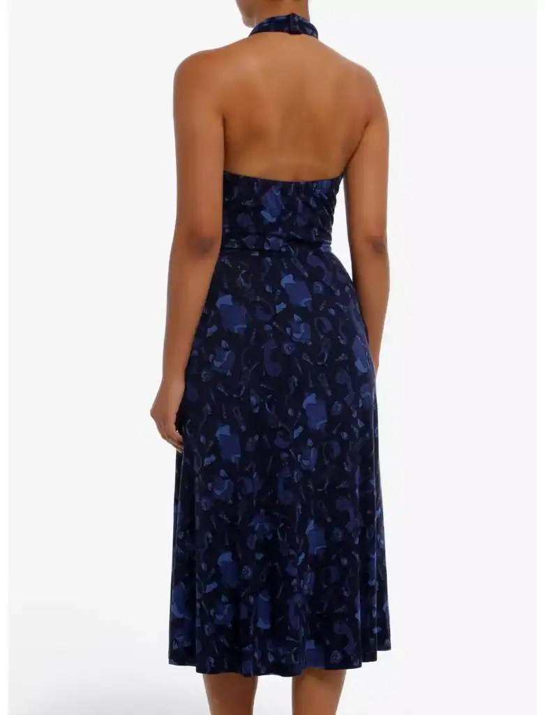 This halter dress is a showstopper, featuring an all-over print of Kuzco, Kronk, Pacha, Yzma, and her signature potions. With its halter neckline, subtle cutout, and thigh slit, it’s an elegant way to nod to your favorite characters while still looking chic.