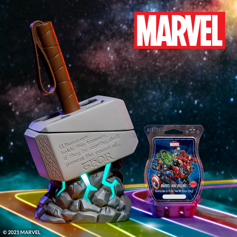 If you are wondering what scent to use with this warmer, you can use the Marvel: Nine Realms – Scentsy Bar that is currently available in the catalog. There isn’t a new scent with this warmer but that’s okay when there’s a great scent already available!