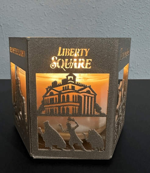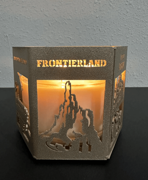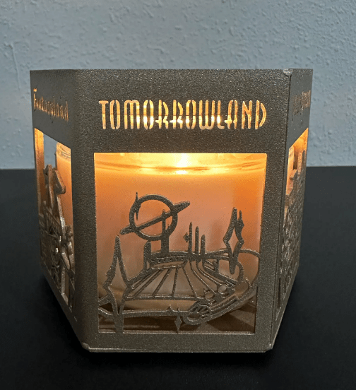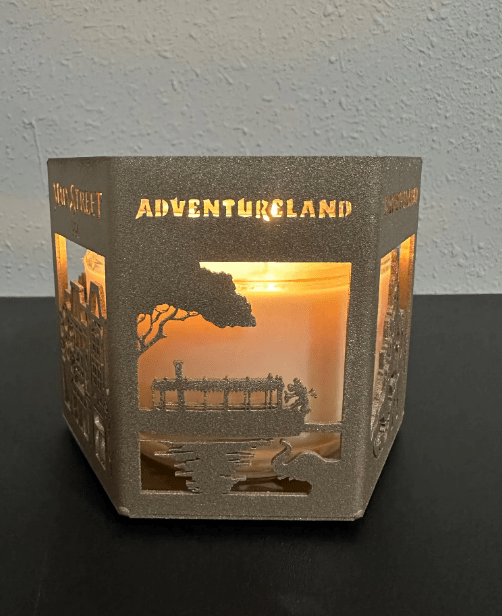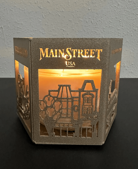 The metal candle holder features beautifully cut silhouettes inspired by each land. As you turn it, you’ll spot Tomorrowland’s iconic futuristic skyline, Fantasyland’s whimsical details, Liberty Square’s stately architecture, Frontierland’s rugged mountain landscape, Main Street, U.S.A.’s charming storefronts, and Adventureland’s jungle vibes. When a candle is lit inside, the warm glow shines through each scene, creating a cozy, magical ambiance that feels straight out of the parks.
