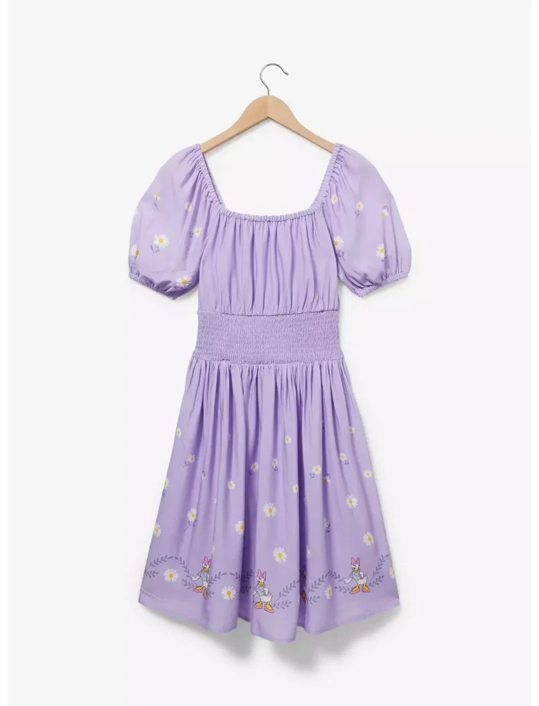 You’ll have oodles of fun in this adorable Daisy Duck dress! Pastel purple fabric features a stylish daisy print, while Daisy herself lines the bottom hem.