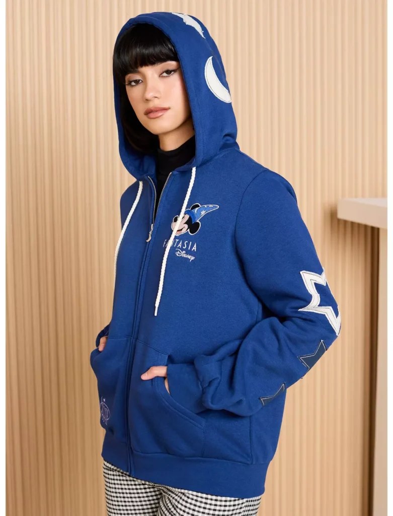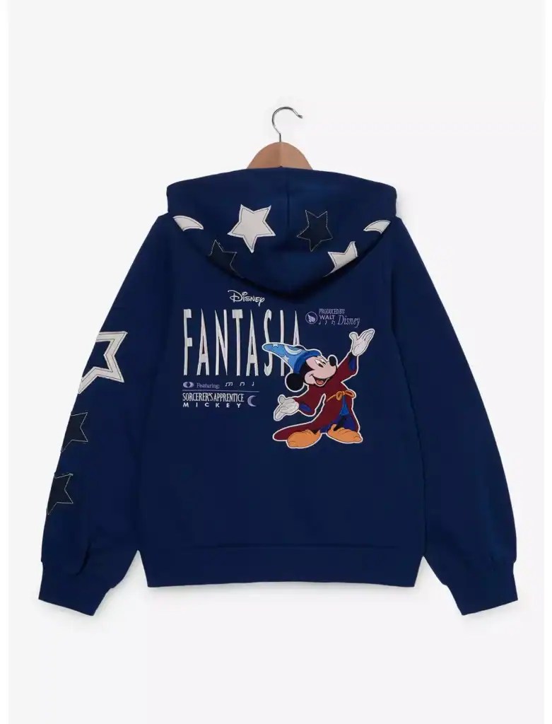 The newest addition to the lineup is a navy Fantasia hoodie. The back features a large embroidered Sorcerer Mickey. Classic film text decorates the design, adding a nostalgic touch. The hood and sleeves steal the show with large star and moon appliqués. These details create a bold, magical look that stands out instantly. The hoodie is warm, soft, and perfect for fireworks nights or chilly park mornings.
