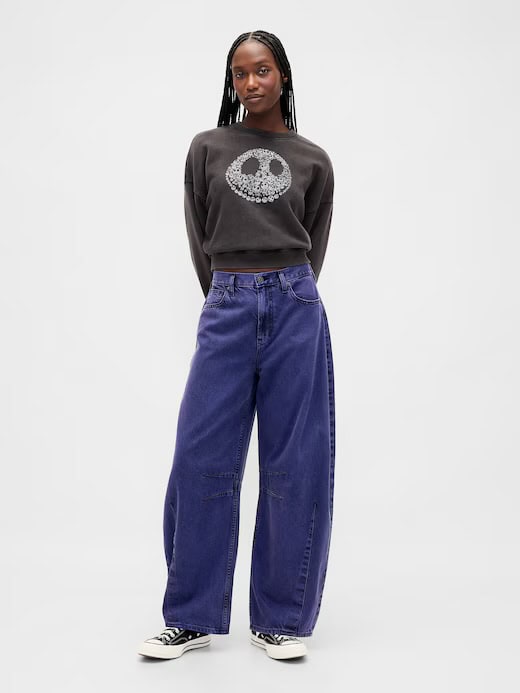 Pair the Jack Skellington Striped ’90s Loose Jeans with the matching Denim Jacket for a look worthy of the Pumpkin King himself! For all-day comfort, the Ultra Soft Barrel Jeans are just as cozy as fan favorites like the tie-dye joggers or flannel skull pajama bottoms, making them perfect year-round staples.