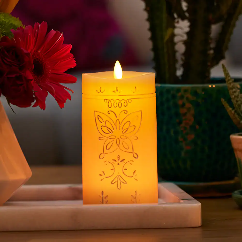 Bring the wonder of Encanto to your home with the Officially Licensed Disney Encanto Candle by Luminara. This enchanting color changing flameless pillar will make you feel like you are part of the magical Madrigal family. The Disney Encanto Candle replica by Luminara shines brightly with a debossed detailed butterfly design. The design is hand carved and features a light touch of metallic cream color paint. Made of real wax, this hand-poured candle illuminates in an Ivory color.