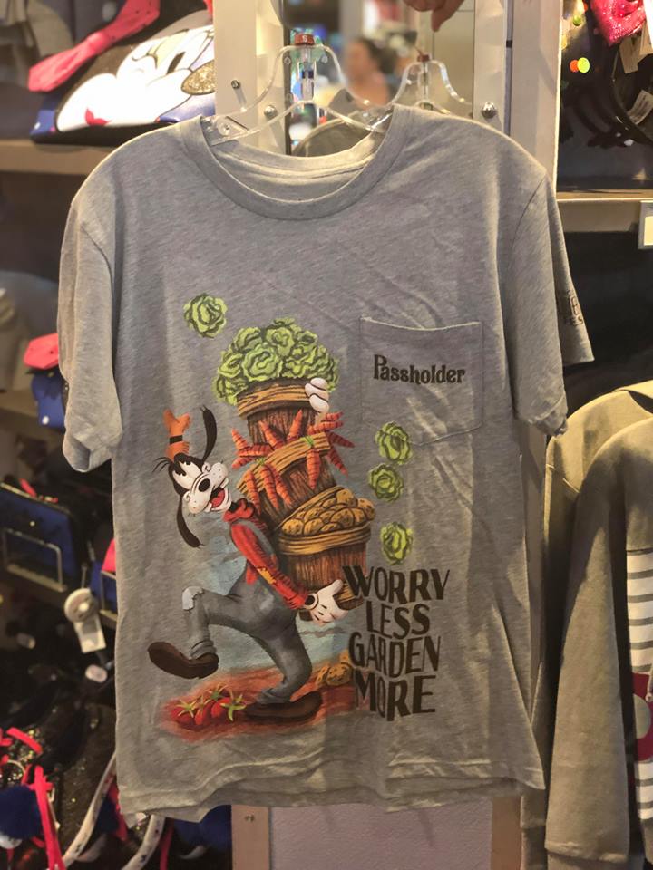 There are also hats to match each new top too! The grey Goofy hat has the same graphic of Farmer Goofy carrying veggies, with the Worry Less, Garden More phrase encircling him. “Passholder” is written out in a chocolate font along the bill of the cap.