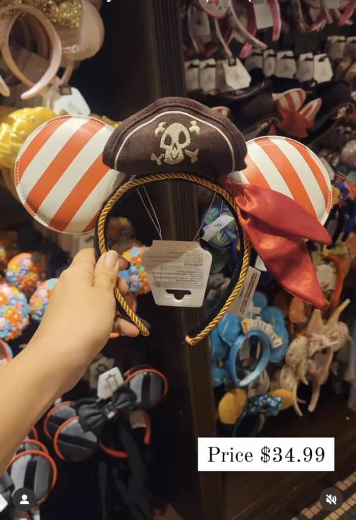 Now something for the pirate in ya, ARGGGG! Whether channeling Elizabeth Swann or Will Turner, adding these ears will guarantee a Jolly (Roger) good time! A smiling skull and cross bones are found upon a black pirate hat which sits nestled between the ears. Legendary red and white stripes round out the theme. I love the added touch of braided rope along the headband, which further adds to the nautical style. Shout out to Courtney, DisneyPixie21, on IG for the Belle and Pirate Ear pictures. These were spotted at Disneyland.