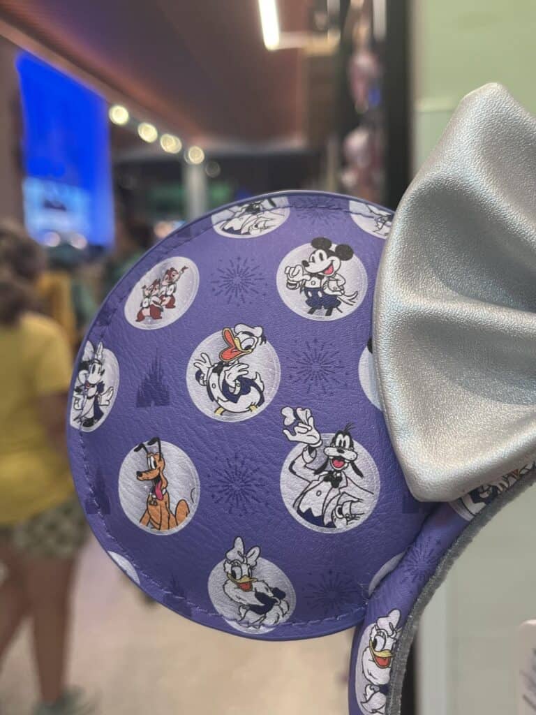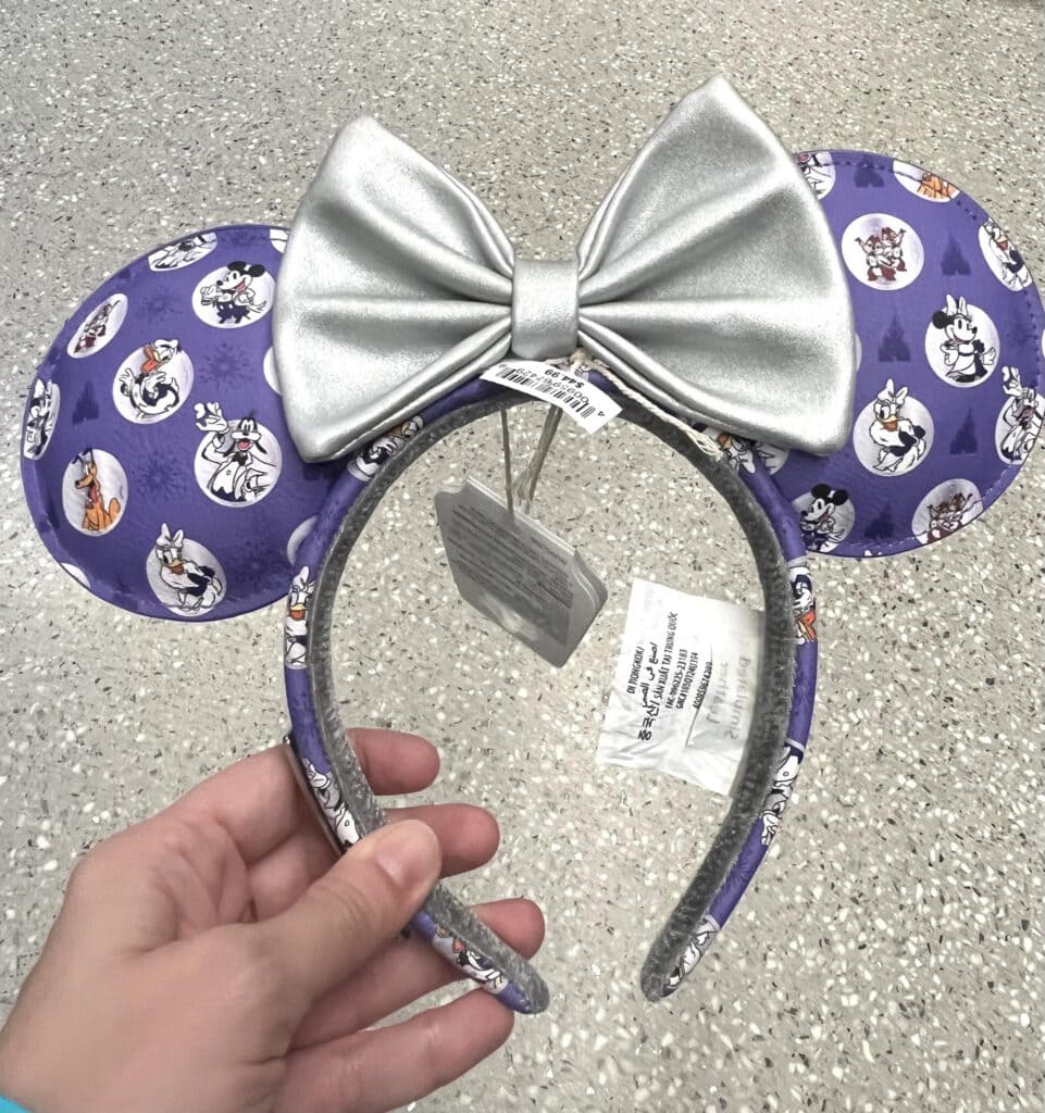 Purple and Silver strike again. All your favorite characters are all together in a polka-dot dream. These Minnie ears feature a purple background with white polka dots. Each character rests inside a white dot and dark silhouettes of the castle float against the purple background. A shimmery silver bow completes the anniversary ears which retail for $44.99. These have been spotted on BOTH coasts!