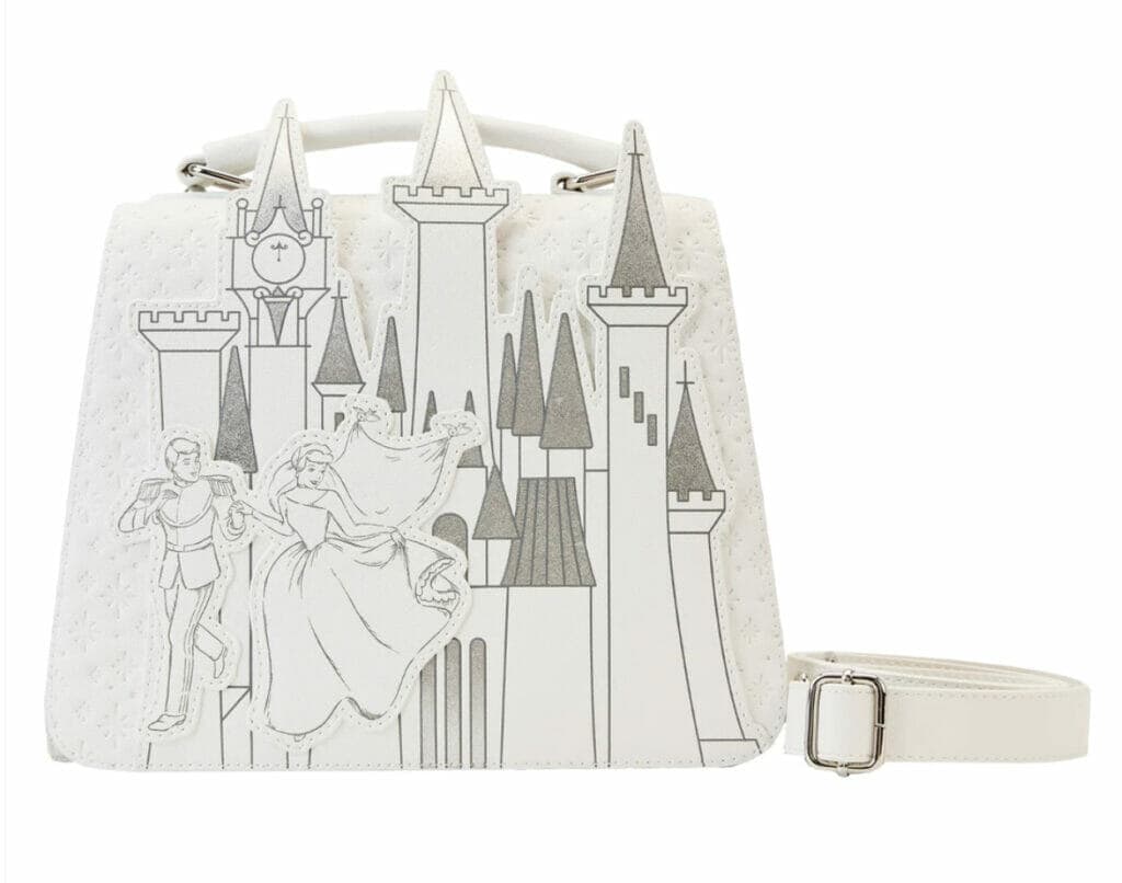 Up next is the crossbody if you need something a tad more dressy than the backpack. It has similar features to the backpack but Cinderella and Prince Charming are leaving their wedding hand in hand instead of sitting in the royal coach. The bag has a top handle as well as an adjustable strap with chain details.