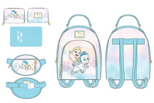 I’m going to jump right into the baby Hercules collection! We NEVER see Hercules inspired items, and it’s such a cult classic. This Collection includes a mini backpack, fanny pack, and wallet. Ethereal sherbert clouds swirl around a baby Hercules taking flight with his baby Pegasus! Sky blue trim and zippers also adorned with lightning bolt charms really pulls the whole design together.