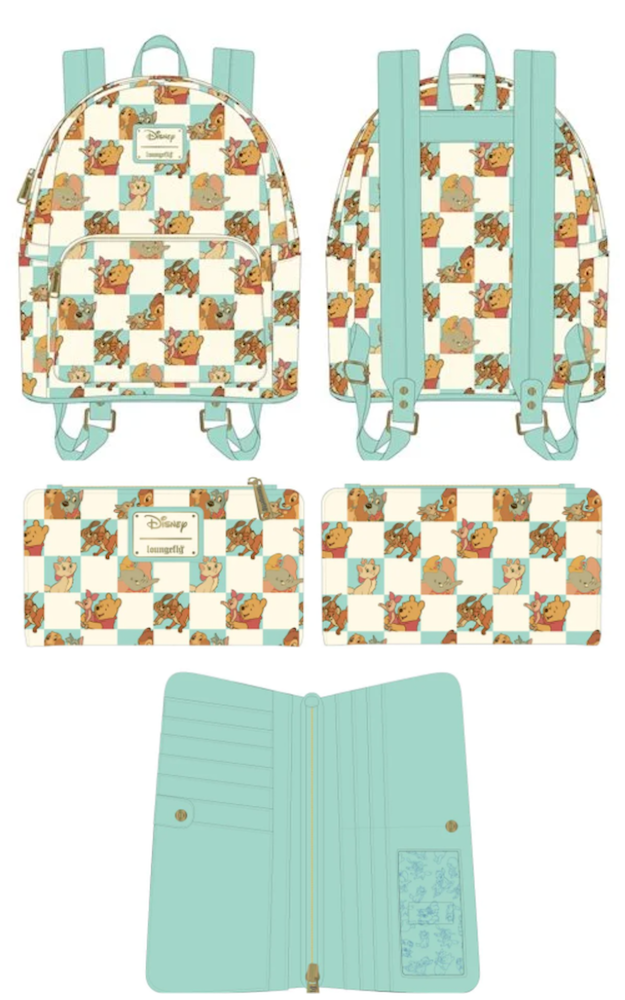 There are also new checked character bags coming. There are two colorways, and each one features a different selection of characters. The minty colorway has leading animal characters! Favorites like Winnie the Pooh & Piglet, Bambi & Thumper, Marie, Dumbo 7 Timothy, Todd & Copper, and also Lady & Tramp fill in the minty colored checkered squares on this bag. Marie seems to be the only one not in a pair for this print too.