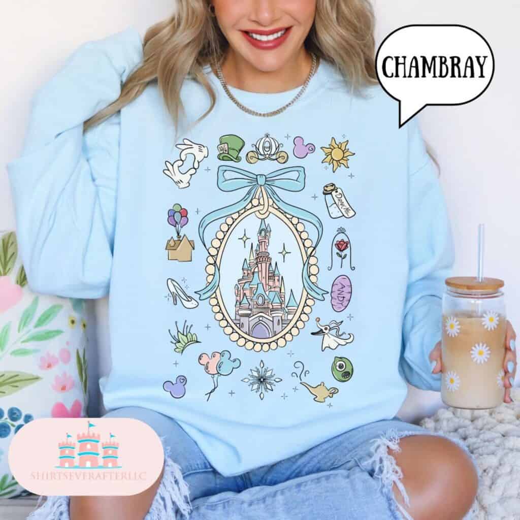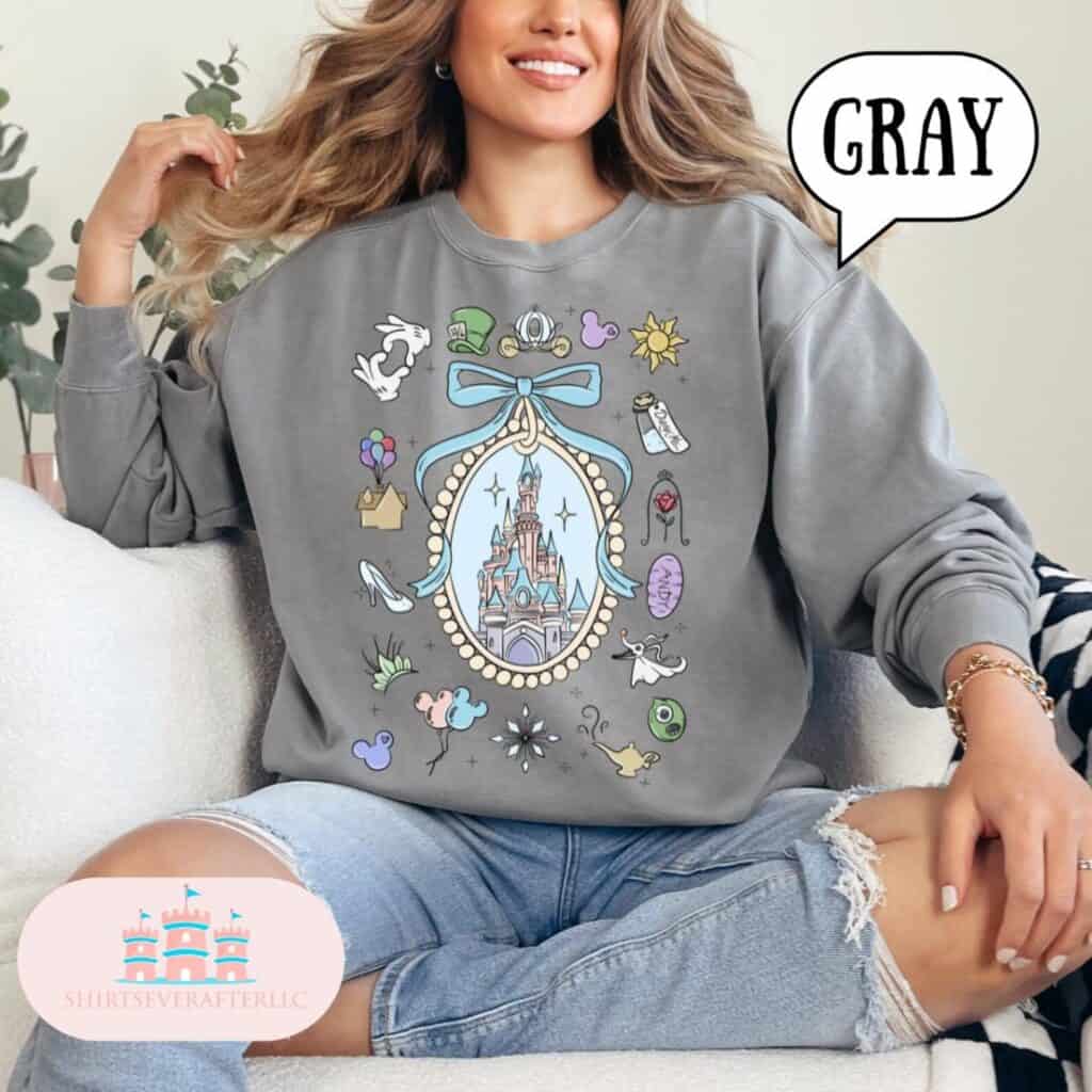 The design itself is truly a celebration of Disney magic. At the center is the castle, framed with a delicate pearl-like border and topped with a pastel blue bow. Surrounding it are nods to beloved films and characters—Rapunzel’s glowing sun, the glass slipper, Mickey gloves, the poison apple, and even Pixar favorites like Mike Wazowski. It’s like a hidden Mickey hunt across your sweatshirt, with each element sparking a new memory from the stories we love.