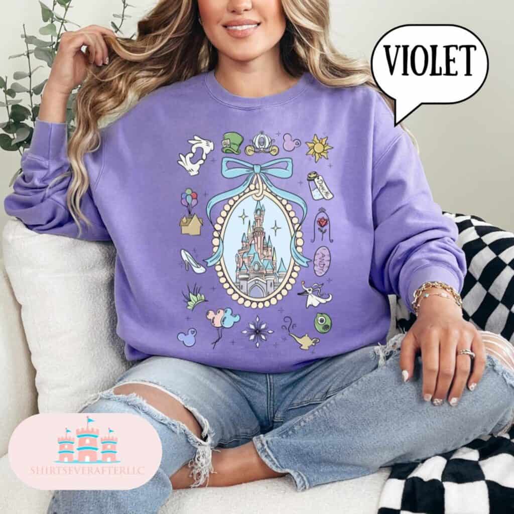 If you’re looking for the perfect mix of comfort and pixie dust, this new Disney-inspired sweatshirt from ShirtsEverAfterLLC on Etsy will have you grinning from ear to ear. Featuring a whimsical illustration of the iconic Disney castle framed with magical icons, this design celebrates everything we love about our favorite stories. From the glass slipper to Mickey balloons, and even a nod to Pixar pals, every detail adds to the enchanting vibe.