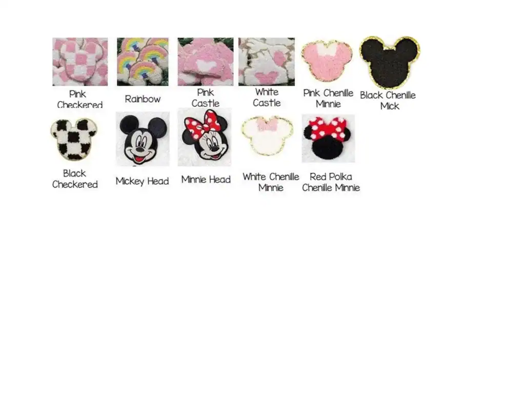 This short-sleeved white tee is made of 100% organic cotton and is carefully hand embroidered with your name. Choose either a pink Minnie head, a classic red bow Minnie head, or a classic black Mickey head. If you want to customize even further, there are other patch options available to you.