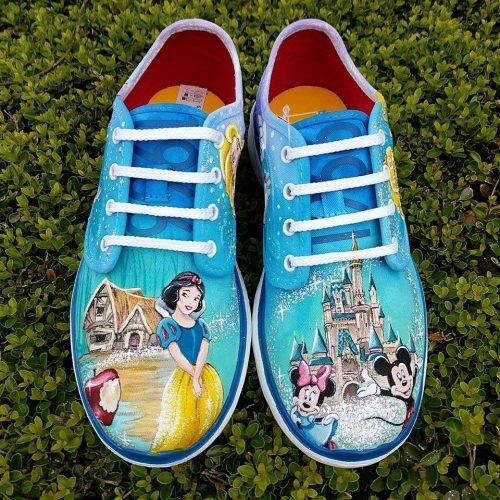 Gigi’s Custom Shoes & Art can be found on Etsy and Facebook. The Artist asked what I was looking for specifically. Since I have 10 grandchildren, I wanted to have each child’s assigned Disney Character on the shoes somehow. She asked me what Characters and sent me a couple of ideas for design and placement. I had a couple of ideas and she was able to visualize exactly what I was looking for. For example, I wanted Snow White somehow with her cottage and the significance of the Apple in there, as well. Her vision of this request turned out beautifully.
