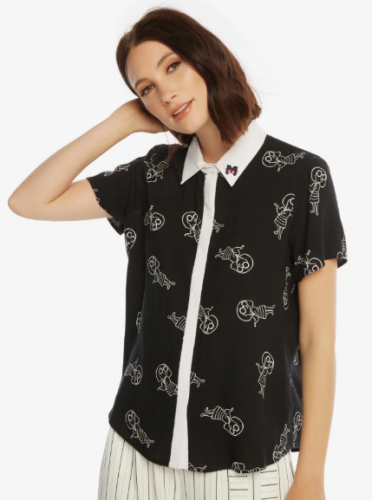 Don’t look back, it distracts from the now! This black and white button-front blouse features an allover Edna Mode print. The marvelous top has a simple line drawing print of Edna on a black background, with white high contrasting details for the collar and buttons. The collar has Edna’s logo stitched onto the corner, for a fabulously put together look. This beauty is a BoxLunch exclusive that you can find on BoxLunch.com for $44.90.