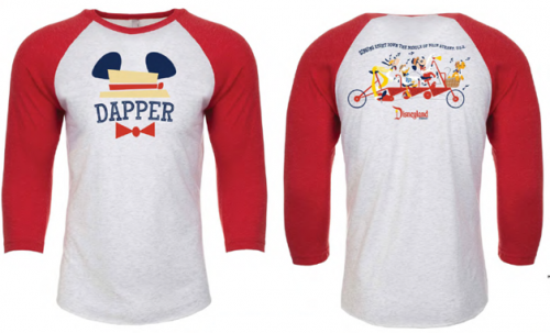 You’ll be Dapper for days on Main Street, U.S.A. in this adult raglan shirt. This red and white top features the Dapper Dans Mickey icon on the front and tandem bike design on the back.