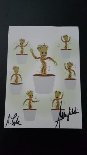 Next up is one of my favorite Marvel characters signed by my favorite 2 Ashleys! This is a piece from the Wonderground Gallery called “Dancing Groot” created by Ashley Taylor. Ashley does much of the artwork for Her Universe/ Disney collabs and this artwork was also released on a tee shirt for her Universe. This piece of art has been signed by both Ashley Eckstein and Ashley Taylor!
