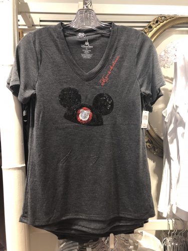 A classic ear hat never goes out of style, but these sequins prove that it can get an upgrade. The ear hat is done in black, red, white, and silver sequins against a background of charcoal gray. “Mouseketeer” is embroidered in red along the neckline. Besides being awfully cute, this shirt is incredibly soft. Like the others in the collection, it comes in sizes XS-XXL and costs $39.99.
