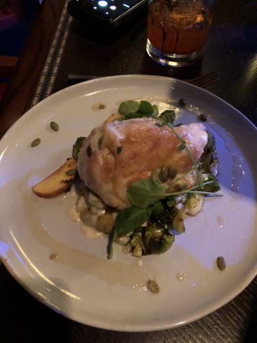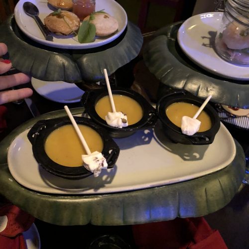 The meal begins with three different appetizers. Our whole table loved the Winter Squash Bisque. It was served in a tiny cauldron, and it was pure deliciousness! The other appetizers included a hunter’s pie and a shrimp cocktail. Since I am a vegetarian, our server Liliana also brought out a separate platter with a steam bun, cherry tomato salad, and Impossible burger slider. It was all so tasty, and I was excited to have some meat-free options!