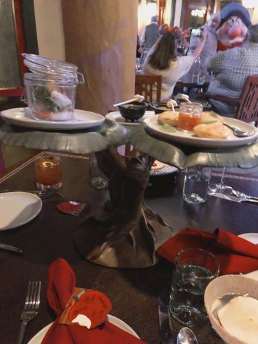 Walking into the restaurant feels like walking into a fairytale forest. Branches decorate the ceiling, and the menu looks like a leather storybook. The napkins have an apple signed by the characters that will visit you during the meal. It makes a nice keepsake or bookmark for later. Each table has a carousel made to look like a tiny tree. The appetizers and desserts fit perfectly on its branches. If Disney sold these carousels, I would snap one up in a heartbeat! It added such a nice touch to the atmosphere!