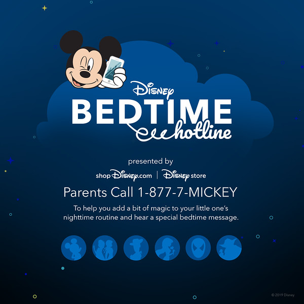 The Disney Bedtime Hotline returns for the second year in a row! Fans and families can call the toll-free number, 1-877-7-MICKEY, to hear six special goodnight messages from Mickey Mouse, Woody, Jasmine, Anna and Elsa, Yoda and Spider-Man, to give kids something to look forward to at bedtime.
