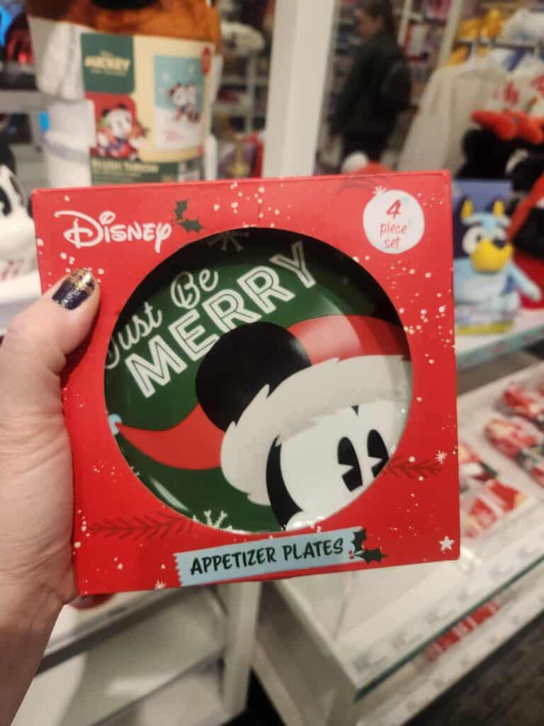 The four-piece appetizer plate set brings festive cheer to parties. Each plate features Mickey or Minnie with a seasonal message. The designs feel retro and bright.