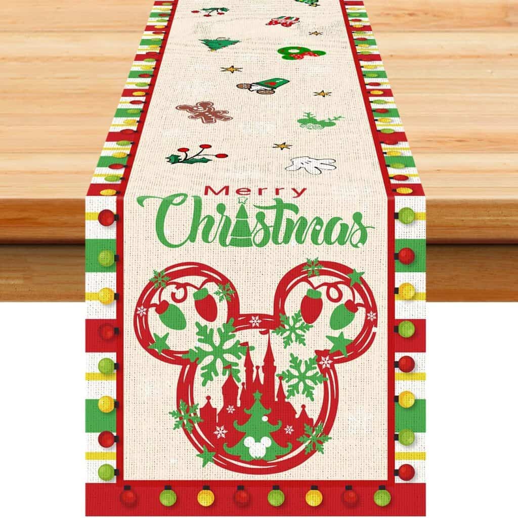 The runner is lined with little red, yellow, and green Christmas Bulbs. At the end, there is a red Mickey head with lights and snowflakes all around it. At the center of the head, there is a castle with a green Christmas tree at the front—sugarplums, Disney Treats, and Mickey Mouse themed holiday decor line the center of the runner.