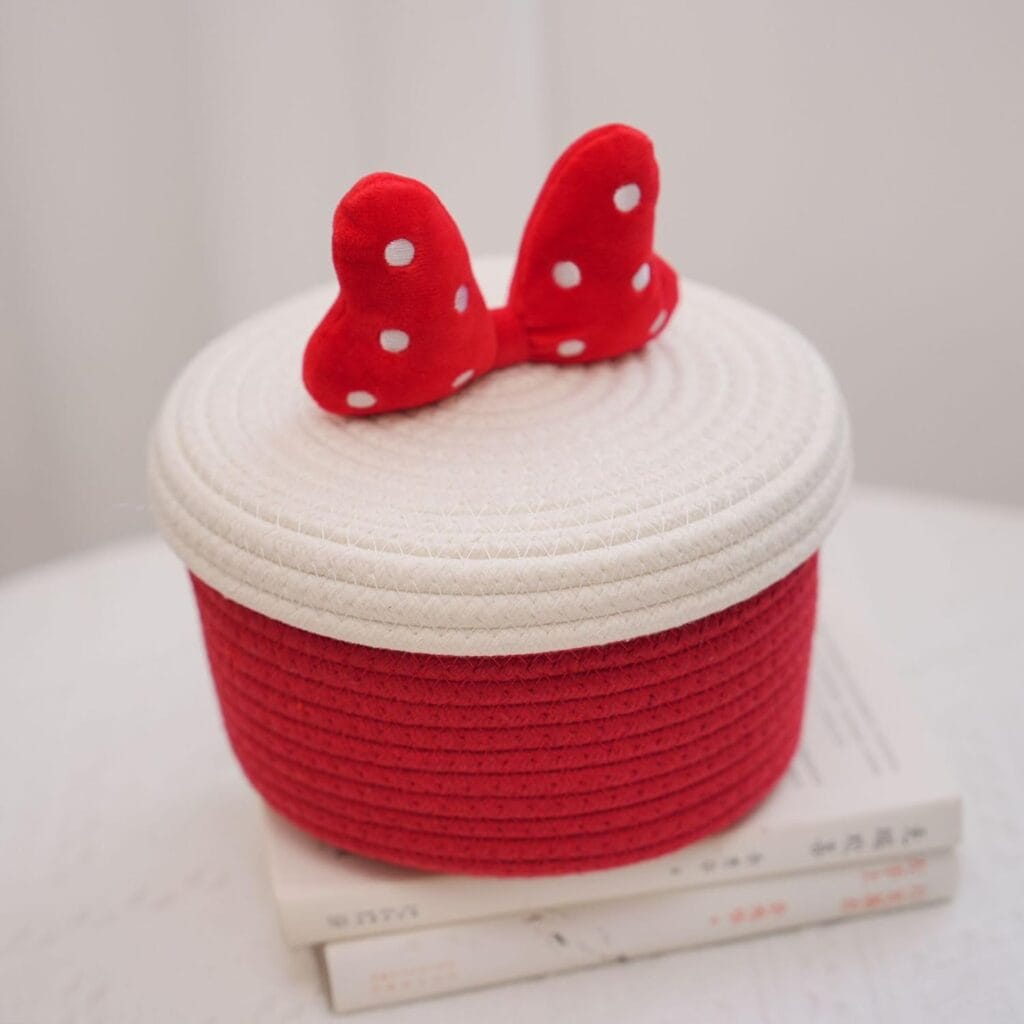 The baskets are Mickey or Minnie themed and they come in different sizes. I love the idea of using the larger Mickey one as a laundry basket! Wouldn’t that be super cute? The Minnie basket is on the smaller side and I could see that in my living room storing books or in my kitchen storing open bags of cookies or bread! There are lots of different options!