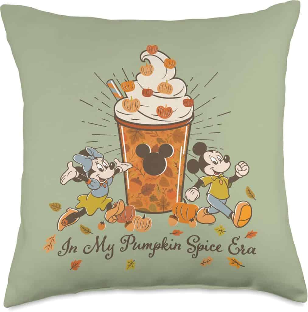 As luck would have it, it seems like we aren’t the only ones who are looking forward to basking in the fall season. Mickey, Minnie, and some of their pals are also eager for the seasons to change. These two throw pillows have everything that we love about Fall and Disney all in two small packages. Mickey and Minnie are out for a brisk autumn stroll on the front of the first pillow, found here. The pillow says, “In My Pumpkin Spice Era”, which is fitting for this week because of the new Taylor Swift album that was just announced. Leaves fall around them as they walk in the pumpkin patch. There is even a yummy drink behind them, which makes for a great reward after walking so far.