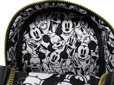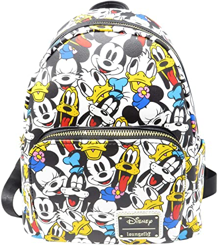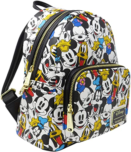 This mini backpack features the classic Loungefly silhouette with a top carry handle, adjustable shoulder straps, a main zipper compartment, side slip pockets, and a front zipper pocket. The exterior features a colorful all-over pattern of Mickey, Minnie, Goofy, Donald, and Pluto while the interior lining features the same pattern in black and white! Gold metal details add to the classic look of this bag.