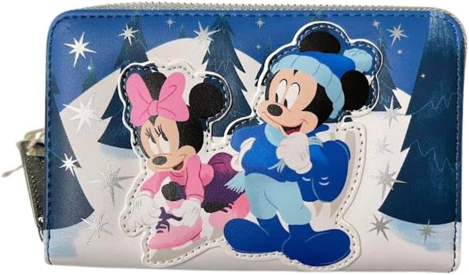 Si estas buscando una mochila y cartera a juego que tengan tema invernal pero no necesariamente navideño este set disponible en Amazon de la marca Loungefly es para tí. En el vemos a Mickey y Minnie en tonos azules, blancos y rosados teniendo una adorable cita en el lago donde se muestran patinando en la mochila y colocándose los patines en la cartera.
