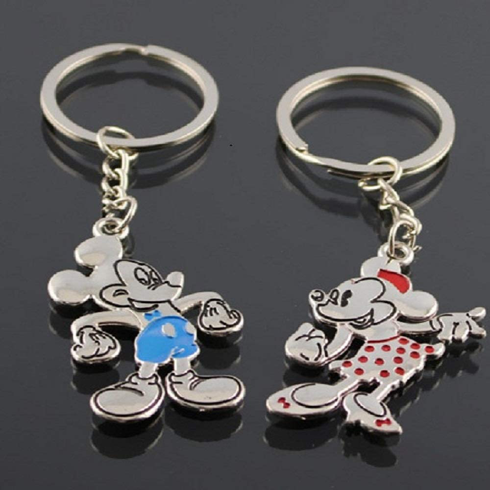 This set of two adorable silver keychains includes a Mickey keychain that features Mickey wearing blue shorts and a matching blue bowtie. The other keychain features Minnie wearing a red hat, a dress with matching red polka dots on it, and even little red bows on her shoes!