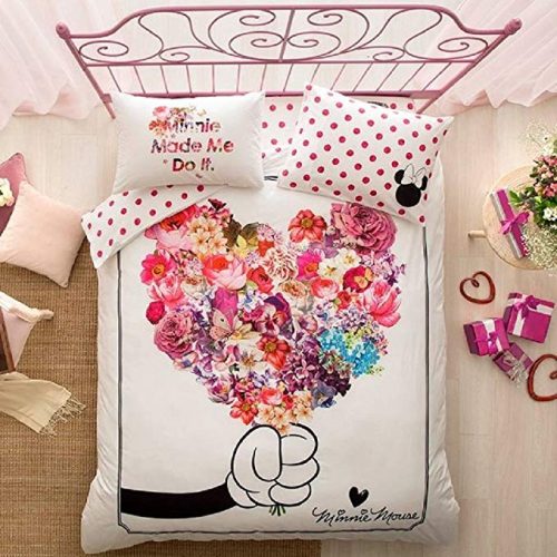 This four piece bedding set included a duvet cover featuring Minnie’s hand holding a handful of flowers shaped as a heart, a fitted bed sheet, and two pillowcases.