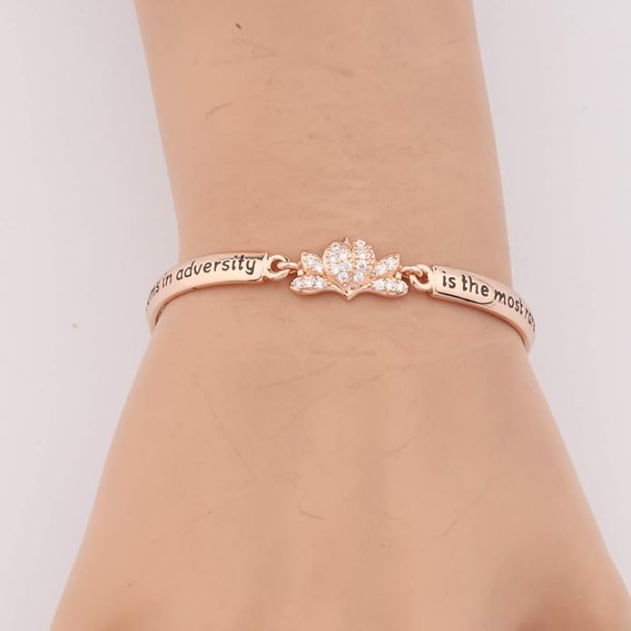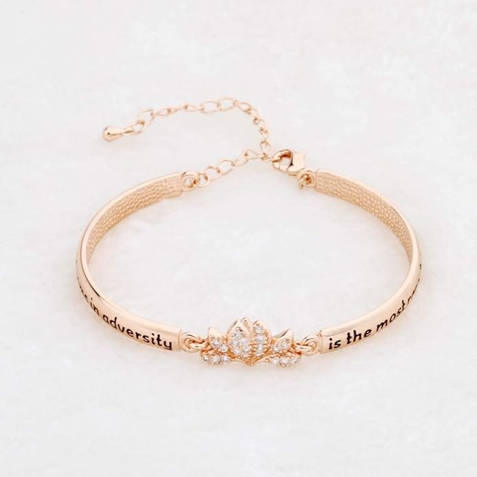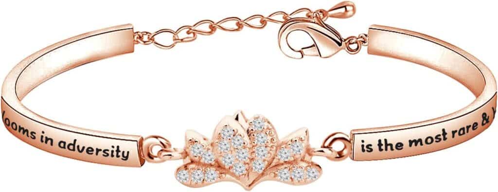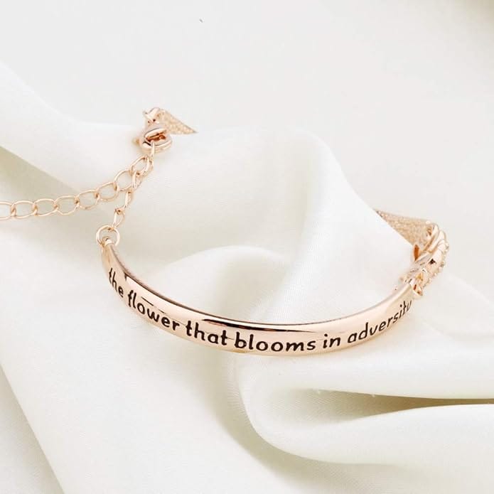 I love all things Mulan related, and this bracelet is not only a gorgeous nod to one of my favorite Disney Princesses, but it also features an encouraging message from the film! At the center of the bracelet is a sparkly rhinestone flower, and surrounding it is the quote “a flower that blooms in adversity is the most rare and beautiful of all.” The lobster clasp and chain at the back allow for this bracelet to have a bangle style with an adjustable size to fit almost any wrist!
