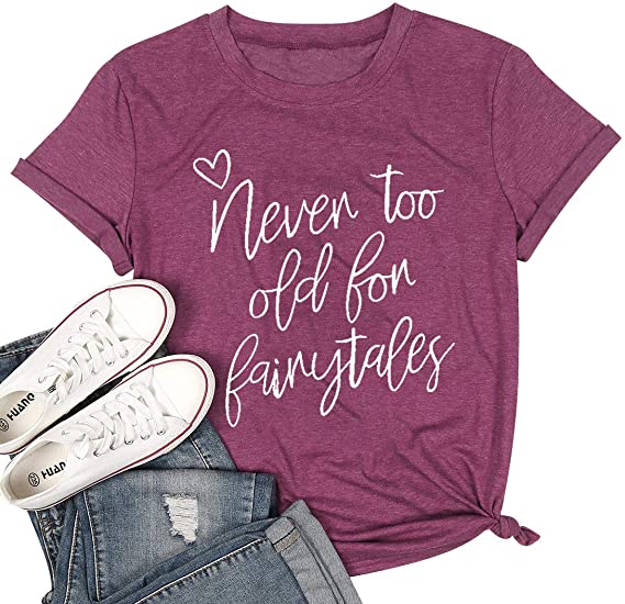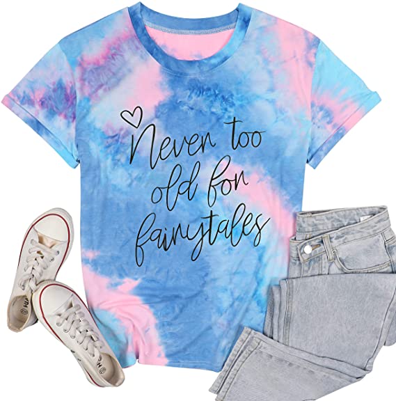 This precious tee is absolutely adorable! It comes in seven different colors– mint green, dark green, deep blue, light blue, light pink, wine red, and cotton candy tie-dye! As if that isn’t enough to make you love it, the graphic on the front features the words “Never too old for fairytales” along with a little heart! This is the perfect shirt for everyday wear or for visiting the parks!
