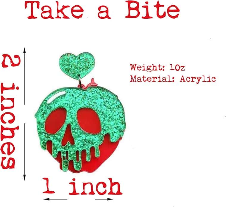Estos aretes son perfectos para la temporada de Halloween, cortados en acrílico con acabado brillante y postes hipoalergénicos, estas manzanas envenenadas inmediatamente nos delatan como fans de La Bruja Malvada de Blanca Nieves y su famosa manzana.