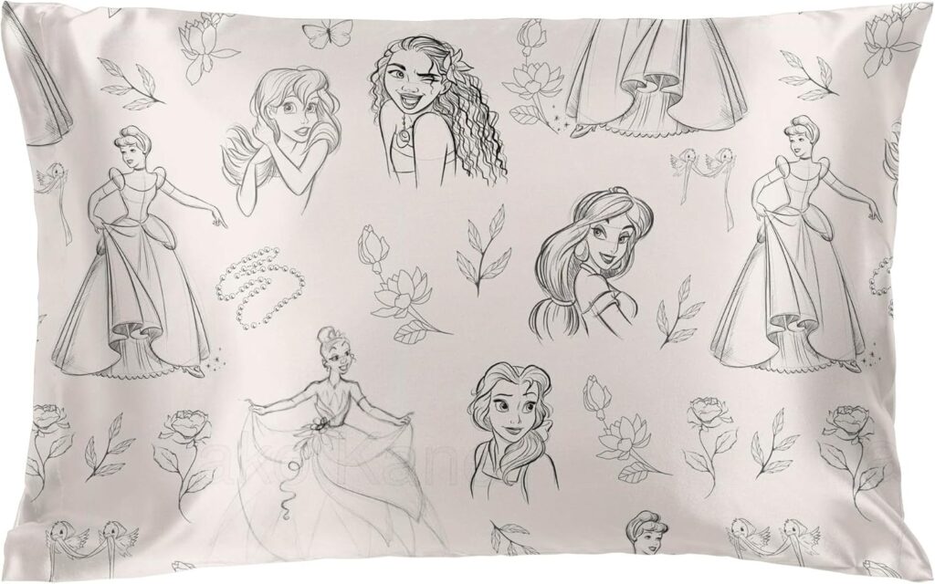 I’ve got princess hair and I don’t care! And, by the looks of it, neither do any of the other Disney Princesses on this pillowcase. Here we see Jasmine, Belle, Ariel, and Moana letting their luscious locks flow without a care in the world. We might even know their secret! It could be because they have been sleeping on a satin pillowcase. Now that you know, you will be able to jump on the carriage and have gorgeous hair just like your favorite royal friends. Even Cinderella‘s bird friends are here to support you and make you feel fresh and ready to start your day. After a few nights with them, you might be ready to do your hair just like Cinderella and Tiana.