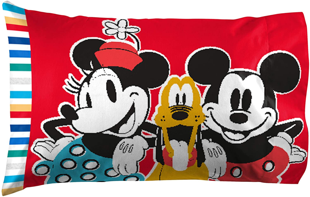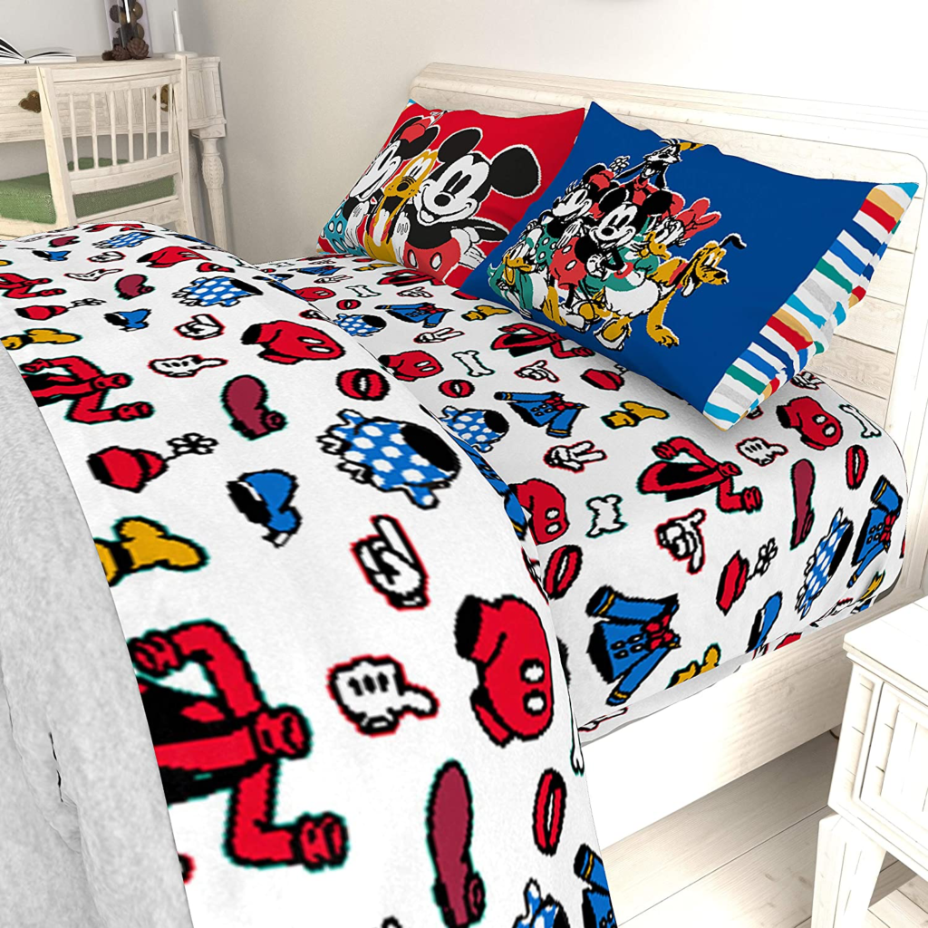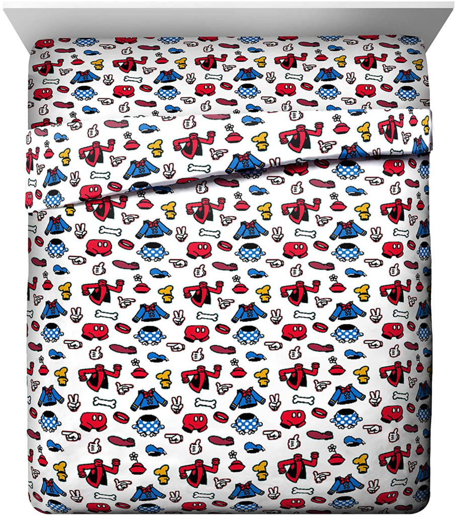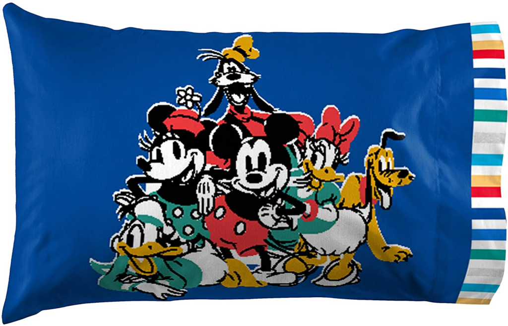 This adorable 4-piece queen-size sheet set includes a fitted sheet, a flat sheet, and two standard pillowcases. The sheets feature an allover pattern of the Sensational Six’s iconic clothes including Goofy’s hat, shoes, and jacket, Minnie’s hat and skirt, Mickey’s gloves and shorts, Pluto’s collar and bone, and Donald’s shirt and hat all on a white background! One of the pillowcases features Minnie, Pluto, and Mickey, while the other features all of the Sensational Six! The colorful stripes on the edges of the pillowcases add a bit of extra magic!