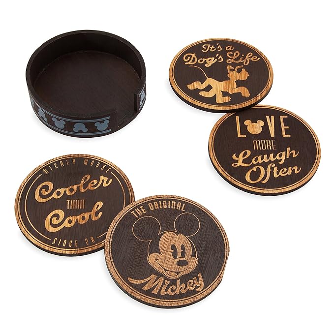 This set of four coasters features Mickey, Pluto, and kitschy text phrases.