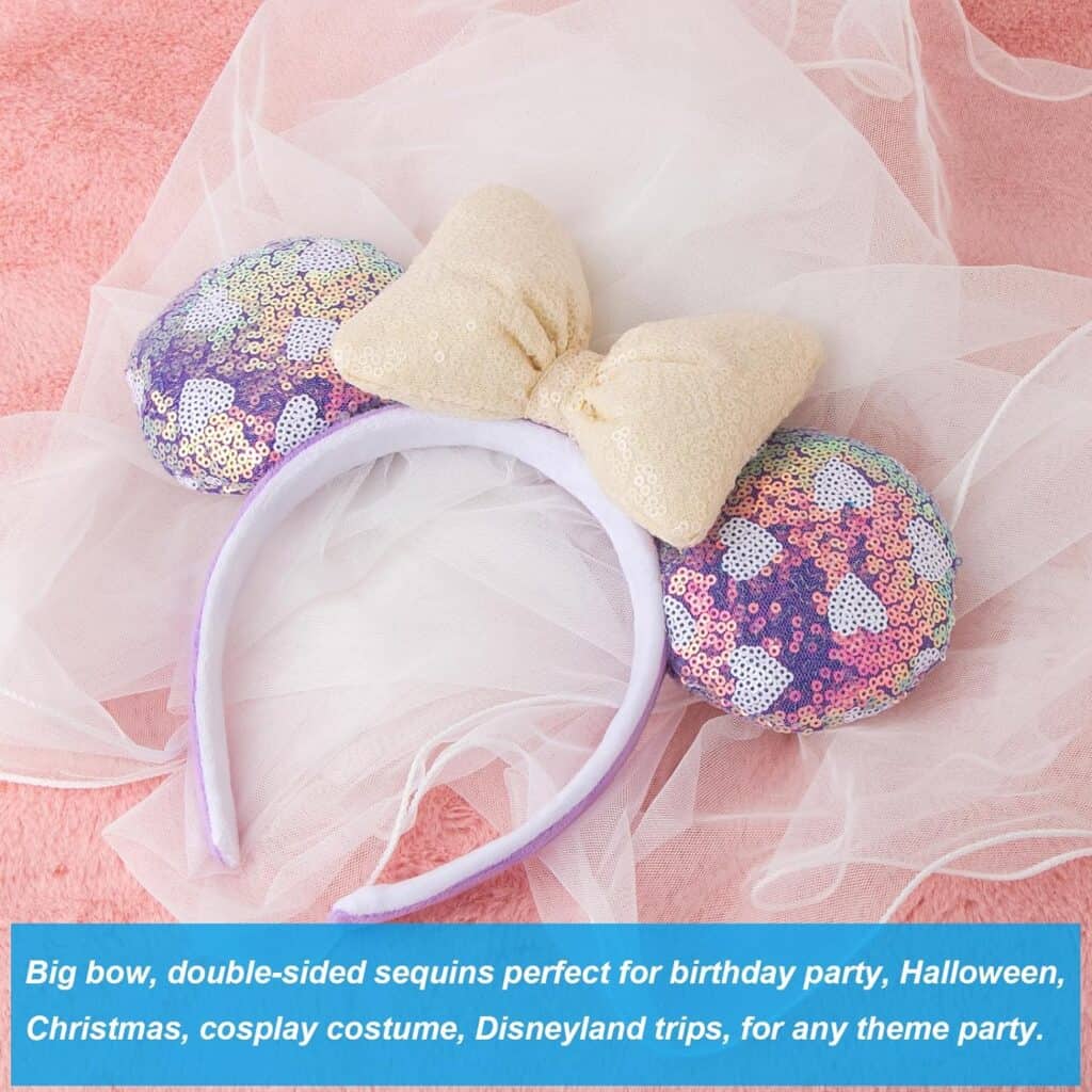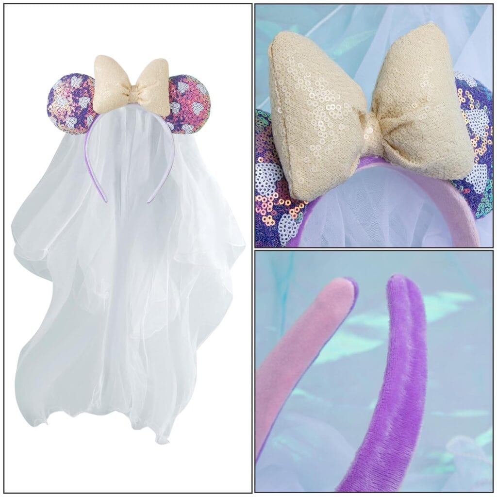 There are so many amazing details on these ears, and I just can’t get over how pretty they are! If you’re like me and love wearing a veil, these are perfect! These gorgeous ears feature an off-white sequin puff bow, iridescent purple sequin ears with white sequin hearts, and a purple and pink headband. Beautifully draping off the back is the fabulous white veil! The best part is that they’re super affordable, so you can check out all the other variations, too! There are options with colorful veils and even some without veils–all at the same great price!