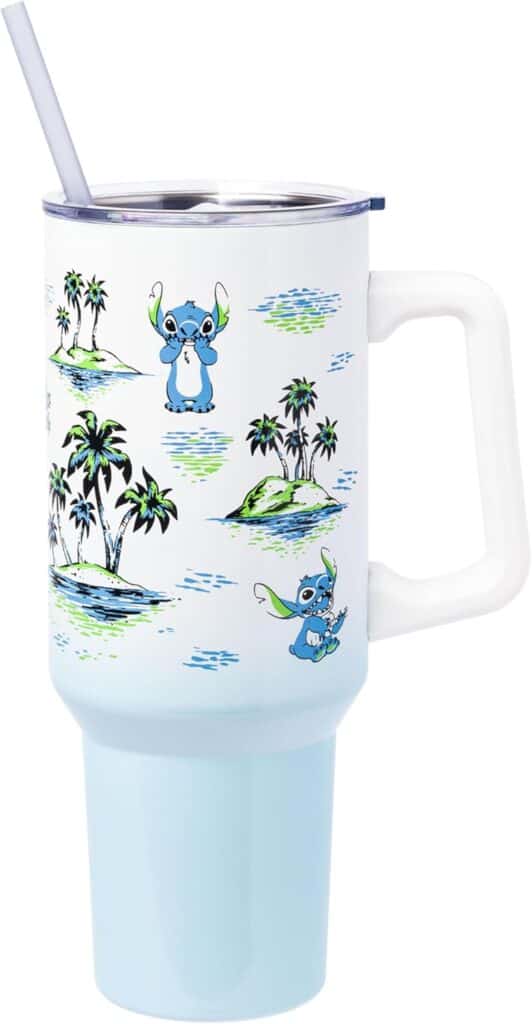 The tumbler has an ombre look with an ocean blue bottom that fades into a white, sandy beach color. This cup is bringing us one step closer to Hawaii, and I’m not complaining at all. I can picture myself at the beach with Stitch as we speak.