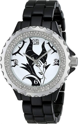 This watch pairs the style of high end watches like Michael Kors and the heart of Disney. The watchband is black enamel and the watch face features a ring of crystals to anchor a beguiling Maleficent at the center.