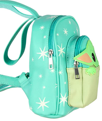 This precious backpack is called a micro mini backpack because it is a bit smaller than the normal mini backpacks. It is nine inches high and features adjustable straps and a long top-carry handle so it is easy to hold! The main body is a fabulous mint green with stars and main zipper compartment. The front zipper compartment has to be my favorite part! This adorable pocket features Grogu’s head and hands peeking up out of a little bag! His 3D ears, giant precious eyes, and teeny little hands are simply squee-worthy!