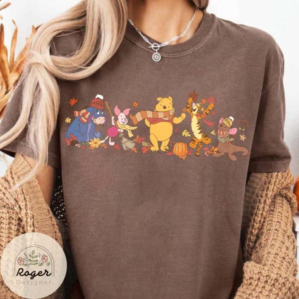 If you prefer a softer fall vibe, the second design by RogerDesigner is a must-have. Winnie the Pooh, Piglet, Tigger, Eeyore, and Roo stroll together in cozy scarves and knit hats, surrounded by autumn leaves and pumpkins. This shirt radiates harvest-time happiness and looks like it came straight out of a storybook walk through the Hundred Acre Wood. The warm brown base makes it easy to style with a chunky cardigan or jeans, and just like the Mickey shirt, it’s available in several color options to fit your fall mood.