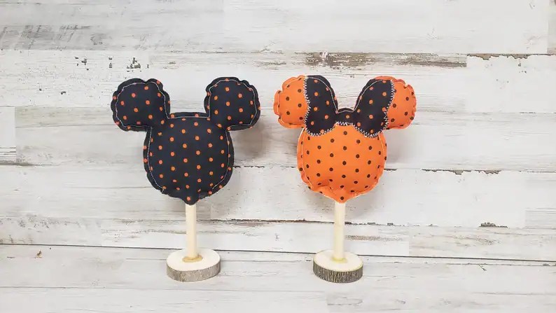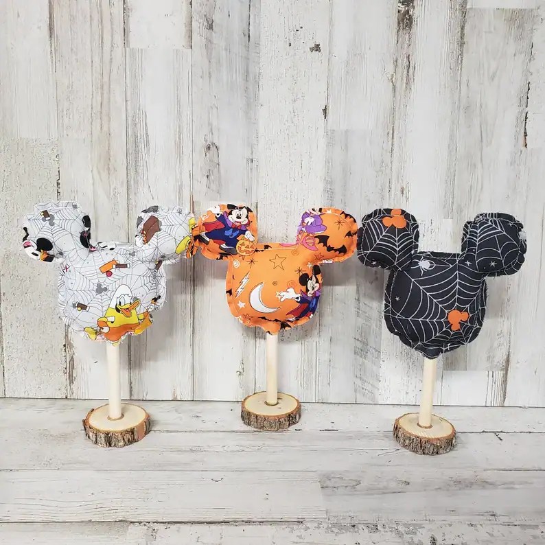These fabric Mickey heads would make a perfect addition to your Disney inspired decor. Each one stands approximately 5″ wide and 7″ tall. They can be added to a tiered tray, shelf, or table for that extra pop of Halloween style and fun.