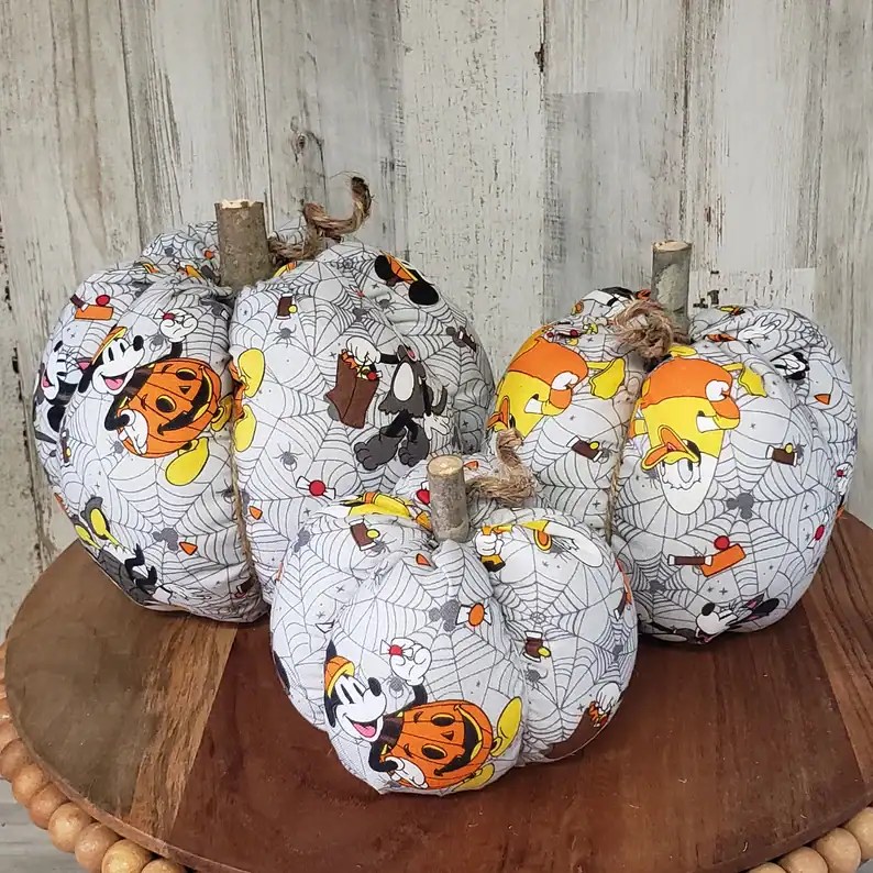TreeificCreations en la plataforma Etsy te tiene opciones adorables de decoración para tu temporada de Halloween. Elige entre estas cabezas de Mickey Mouse con base de madera o estas calabazas en diferentes tamaños con un tallo de madera también. En telas que tienen motivos de telarañas, calabazas, arañas, dulces y Mickey y sus amigos, estas decoraciones serán reutilizables por muchos años por venir.