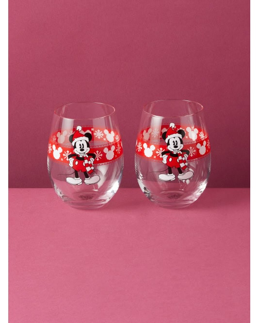 Enjoy a merry moment during your at-home happy hour with the festive finish of these nostalgic wine glasses. These glasses feature Mickey Mouse dressed in his Christmas best and ready for a day of cold-weather fun. He wears a festive Santa hat and coordinating scarf. Add a bottle of wine, and you have the perfect host or hostess gift this holiday season!