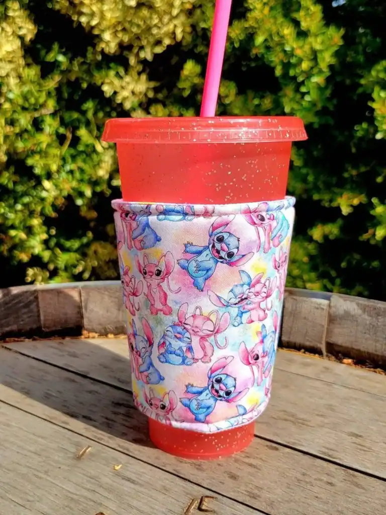 This iced coffee cup cozy features two cute creatures in a beautiful watercolor style. Stitch and Angel are cuddled up and having fun on this pretty pink and blue sleeve. This style is great for any fan of Lilo and Stitch or for those who want to show their Disney style wherever they go. You can get it HERE.